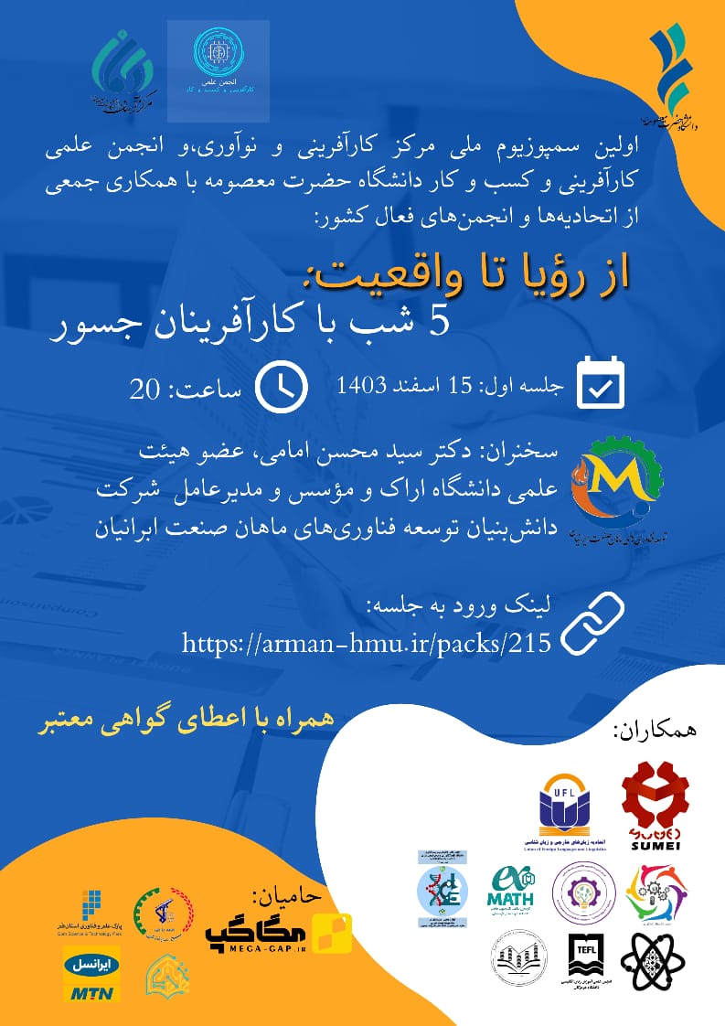 جلسه اول: در نخستین جلسه این سمپوزیوم، دکتر سید محسن امامی، عضو هیئت علمی دانشگاه اراک و مؤسس و مدیرعامل شرکت دانشبنیان توسعه فناوریهای ماهان صنعت ایرانیان، به عنوان سخنران ویژه حضور خواهد داشت. وی در این رویداد، چالشها، فرصتها و مسیر موفقیت در حوزه کسبوکارهای دانشبنیان و استارتاپ ها را بررسی خواهد کرد.